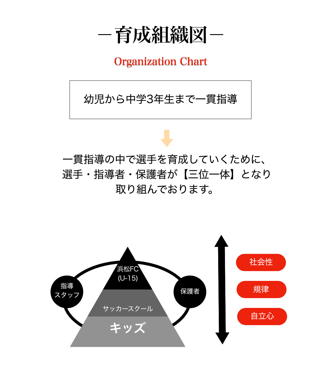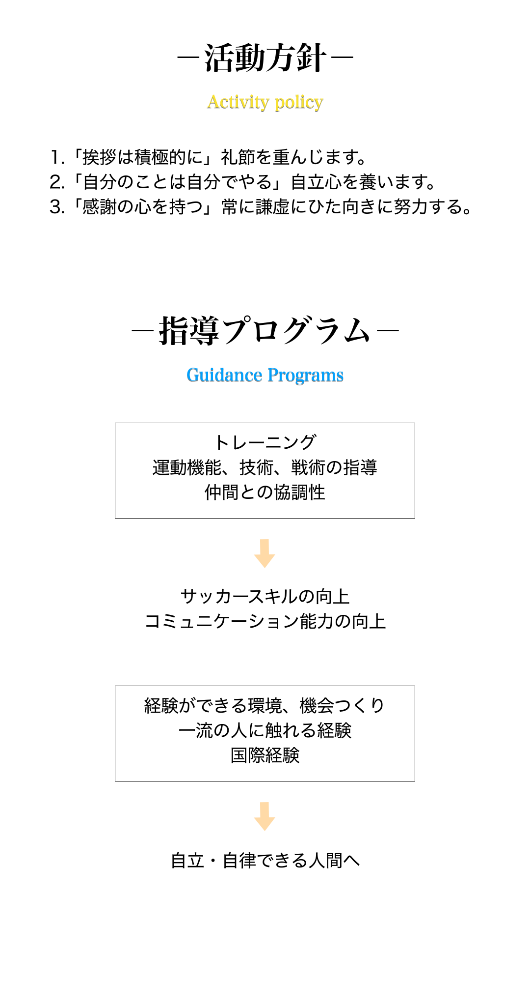 世界中で愛されているサッカーを通じて人間形成に重点を置き、サッカーが持つ「力」を活かして世界に羽ばたく選手を育成していきます。