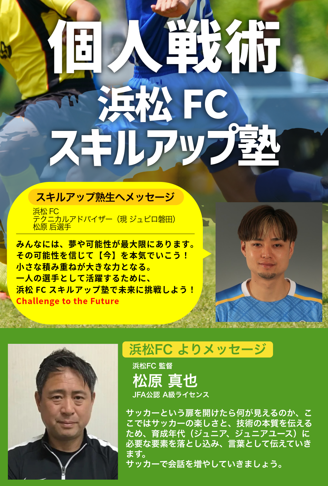 を意識して、小学生年代~中学生年代でしか身に付けられない個の技術を、"浜松FCスキルアップ塾" で身に付けていく。
